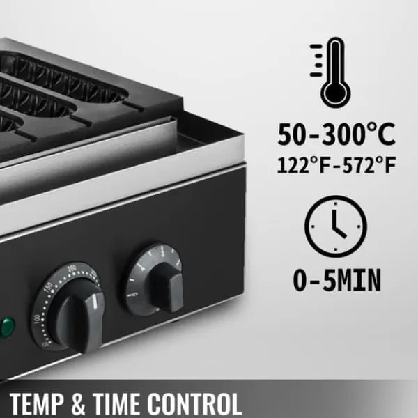 -Exakt temperatur- och tidskontroll: Denna våffelpinnemaskin är utrustad med två rattar för exakt temperatur- och tidskontroll, temperatur 50-300°C (122-572°F) justerbar. Nedräkningstimer (0-5 minuter) säkerställer effektiv och bekväm drift. Maskinen har även en indikatorlampa för att visa arbetsstatus.