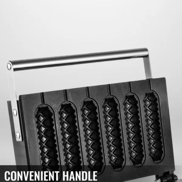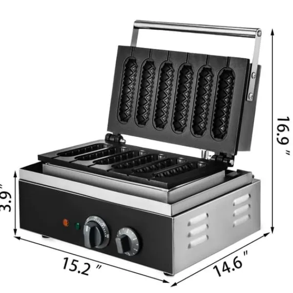 Denna korvvåffla är så attraktiv att produkten kommer att hålla i flera år eftersom kroppen är gjord av förtjockat rostfritt stål av livsmedelskvalitet medan den snygga tallriken är gjord av gjuten aluminium. Den temperaturjusterbara vridknappen gör det superenkelt att göra 6 våfflor samtidigt på 1-5 minuter utan att förbruka för mycket ström. Perfekt för bagerier, evenemang och mer.