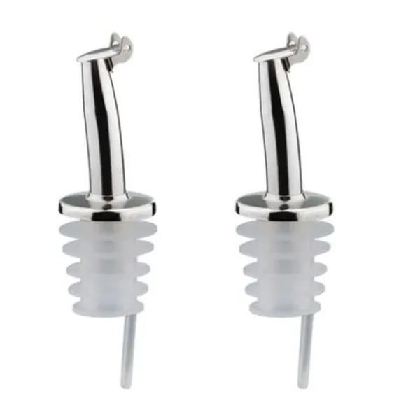 2 hällpipar med spärr. Med sin luftkammare och spärr gör denna högkvalitativa hällpip det möjligt att hälla olja eller vinäger med mer precision. Med standardmått passar den de flesta flaskhalsar. Diskmaskinsvänlig, hällpipen är designad i tåligt rostfritt stål och silikon. Användbara mått 7 cm.