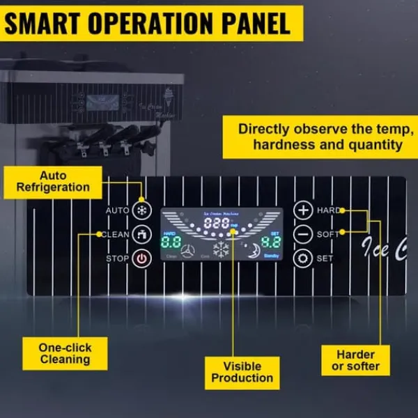 -Smart LCD-panelkontroll: Du kan ställa in tid, temperatur och hårdhet med den bekväma LCD-kontrollpanelen. Kvantiteten kommer även att visas på skärmen för direkt observation och glassmaskinen kan snabbt börja självrengöra med bara en knapptryckning.