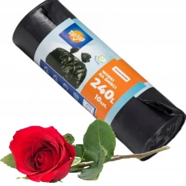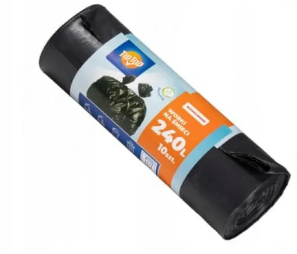 TIP TOP svarta sopsäckar med en kapacitet på 240 liter är designade för osorterat eller blandat avfall som inte kan klassificeras i en annan kategori, såsom medicin- och kosmetikaförpackningar, trasiga diskgods, använda blöjor, pappershanddukar och vävnader, kläder och mycket mer. Tillverkad av slitstark film tillverkad av återvinningsbar plast, kommer de inte att rivas under vikten av de insamlade materialen och är miljövänliga. De är perforerade för enkel rivning.