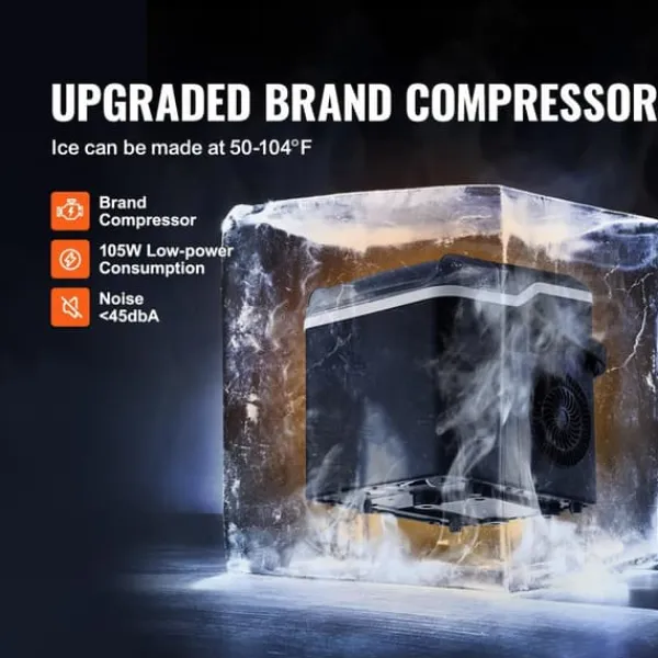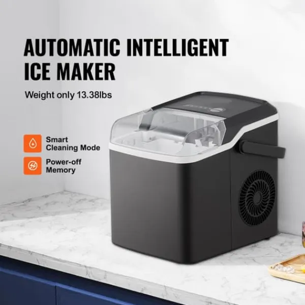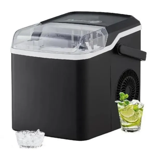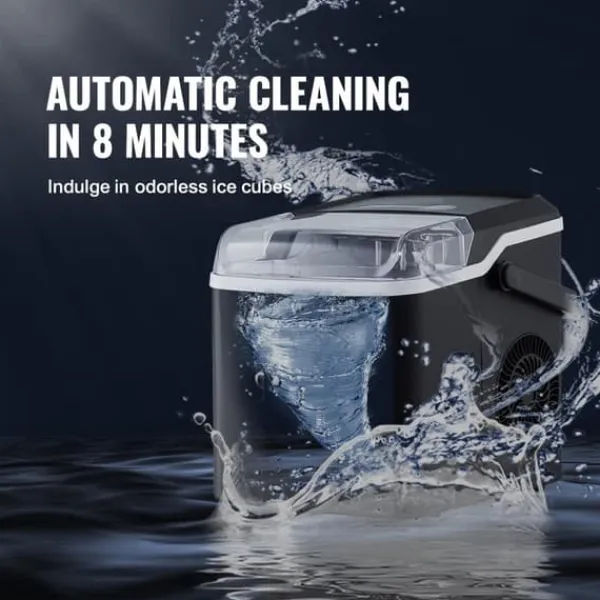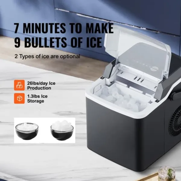 -Denna bärbara ismaskin producerar 26 lbs is per 24 timmar (vid 70°F testmiljö och 59°F inloppsvattentemperatur) och kan förbereda 9 isbitar på 7 minuter. Med en kapacitet på 1,3 lbs är den lätt att ta med sig till fester och picknickar. Njut av ren is när som helst.