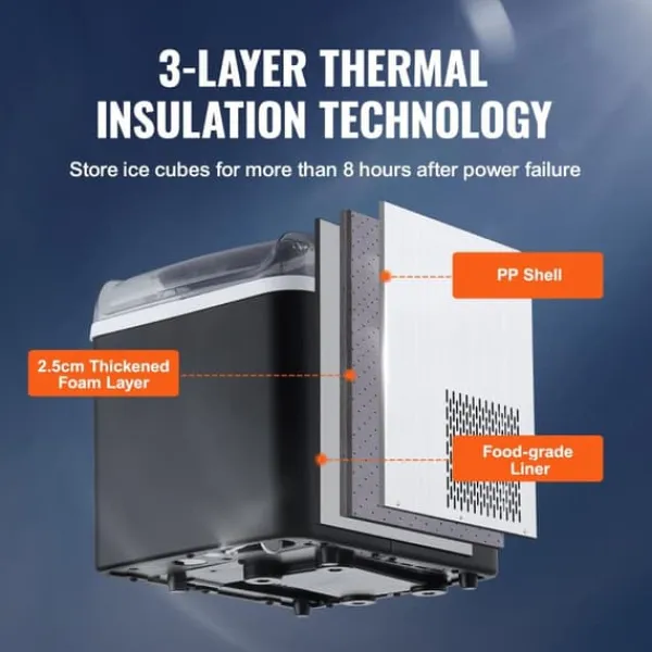 -Håll kylan inne: Den bärbara ismaskinen har ett 2,5 mm skumlager och tre lager isoleringsmaterial, vilket gör att den kan hållas i över 8 timmar vid strömavbrott.