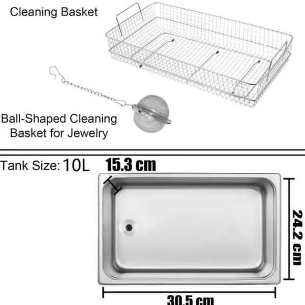 Denna ultraljudsrengöring för smycken har en 10L tank med rengöringskorg och en sfärisk smyckesrengöringskorg för att minska friktionen under tvätt.