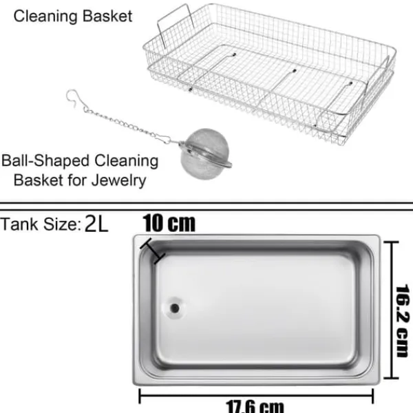 Denna ultraljudsrengöring för smycken har en 2L tank med rengöringskorg och en sfärisk smyckesrengöringskorg för att minska friktionen under tvätt.
