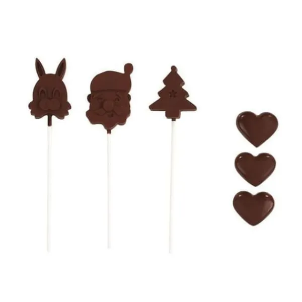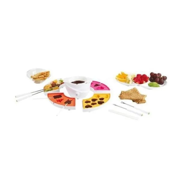 Fondue, skapande av godis och chokladklubbor, 1 bas med 2 värmelägen, 4 modulära fack med 4 avtagbara silikonformar, 24 klubbor. 4 spader. Diameter: 30 cm. Effekt 22W.