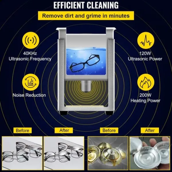 Grondige en zachte reiniging: Met een verwarmingsvermogen van 200 W en 2 geïmporteerde transducers die 40 KHz ultrasone golven produceren, zorgt deze reiniger voor diepgaande reiniging. De microscopisch kleine belletjes verwijderen vuil moeiteloos van oppervlakken en kleine ruimtes.