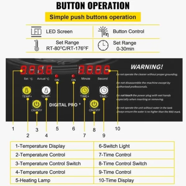 Instelbare tijd/temperatuur: De duidelijke LED-display en drukknoppen maken het eenvoudig om de werktijd en verwarmingstemperatuur in te stellen. Met een bereik van 0-30 minuten en 0-80°C kan de reiniger worden aangepast aan verschillende reinigingsbehoeften.