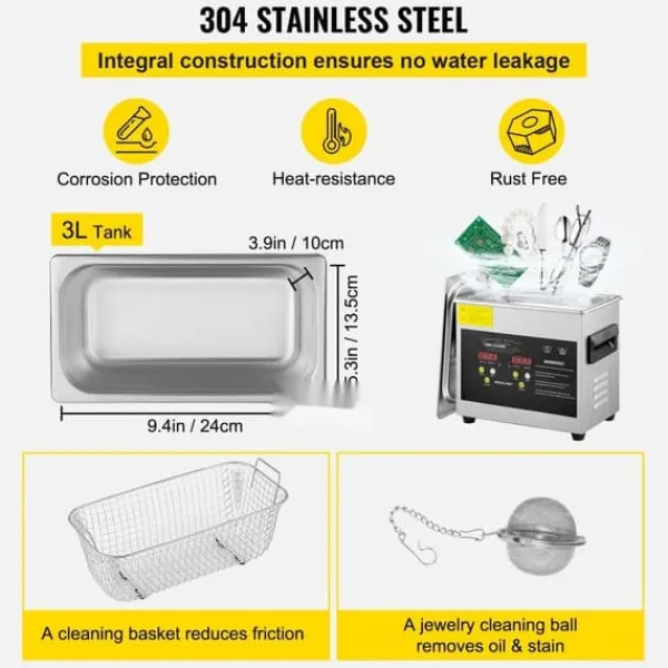 Premium kwaliteit: Vervaardigd van corrosie- en roestbestendig 304 roestvrij staal, garandeert deze ultrasone reiniger duurzaamheid en effectiviteit. Met een tankinhoud van 3 liter, een verwarmingsvermogen van 200 W en ultrasoon vermogen van 120 W biedt deze reiniger hoogwaardige prestaties voor een glanzend resultaat. Geen waterlekkage dankzij de geïntegreerde constructie.