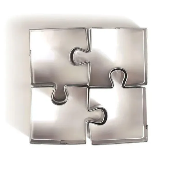 4 kakformer för bakverk eller polymerlera Dessa kakformer i rostfritt stål representerar en kvadrat som är delad i 4 pusselbitar. Självklart är dessa kakformer av livsmedelskvalitet och kan användas för att skära ut kakor, pepparkakor att baka, mandelmassa och även polymerlera. Dimensioner på pusselbitarna: 3,5 x 3,5 cm.