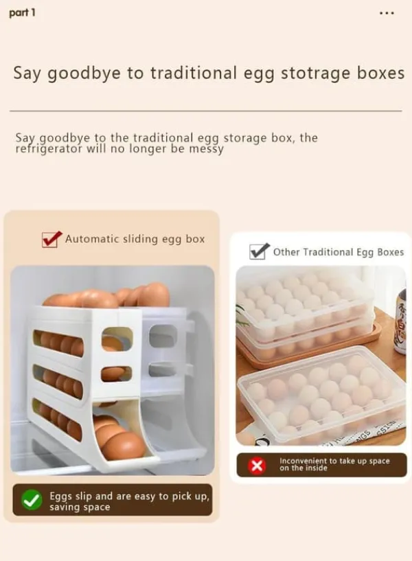 Automatisk äggdispenser – En platsbesparande, robust ägghållare med en gravitationsbaserad rullande design, som rymmer upp till 30 ägg och säkerställer säker, organiserad förvaring i ditt kylskåp eller kök.