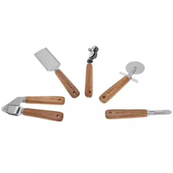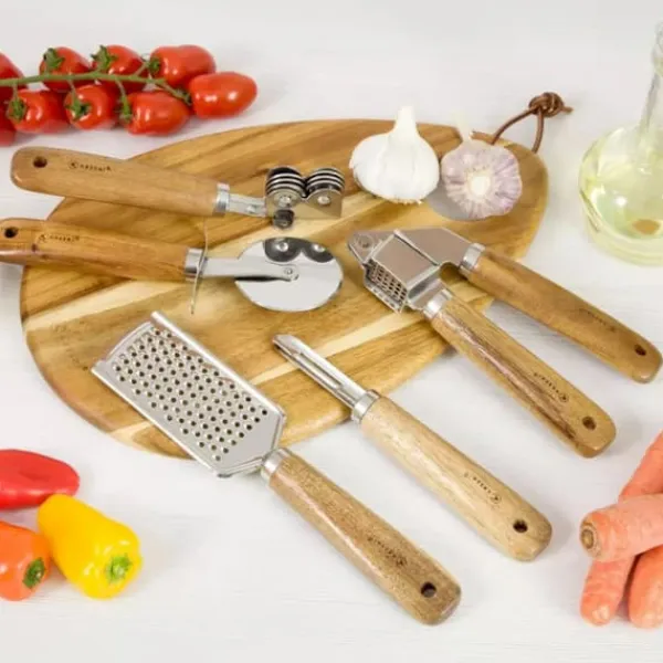 En uppsättning köksredskap av högkvalitativt rostfritt stål och massivt akaciaträ. Setet innehåller: – pizzaskärare – vitlökspress – frukt- och grönsaksskalare – vässare – rivjärn Det hela är förpackat i en estetisk, ekologisk låda.