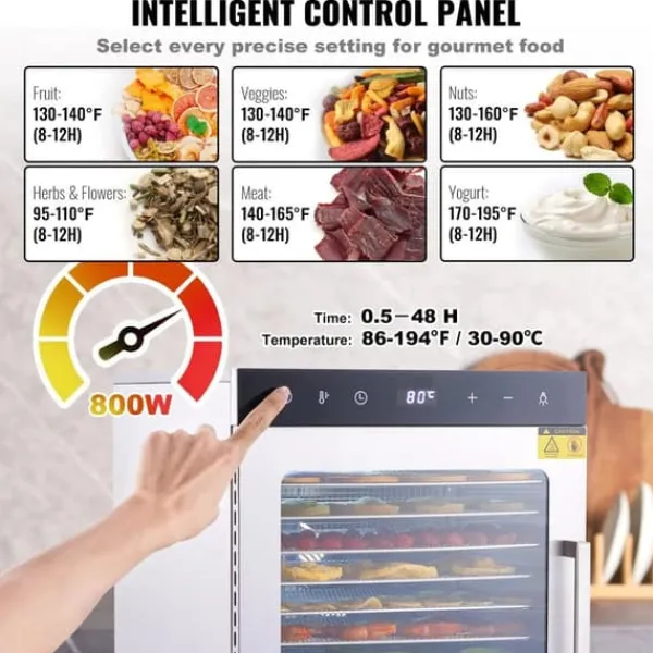 -Förinställda temperaturer sträcker sig från 86°F till 194°F och har en timer som kan ställas in i upp till 48 timmar. Denna stora dehydrator kan torka grundligt och jämnt i 360° utan att rotera, och har överhettningsskydd, automatisk kylning och automatisk avstängningsfunktion.