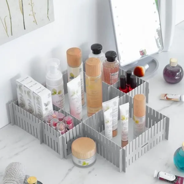 This adjustable drawer organiser adapts perfectly to different dimensions and spaces, according to your needs. It includes instructions for use in order to place it correctly in various positions. The16 units included can be cut and joined together perpendicularly to fully fit the desired space. They can also be positioned vertically.