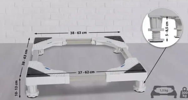 This base is universally suitable for almost all washing machines, as well as other household appliances like tumble dryers, refrigerators, freezers, and more. The base lifts these appliances off the floor, protecting them from moisture.