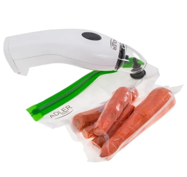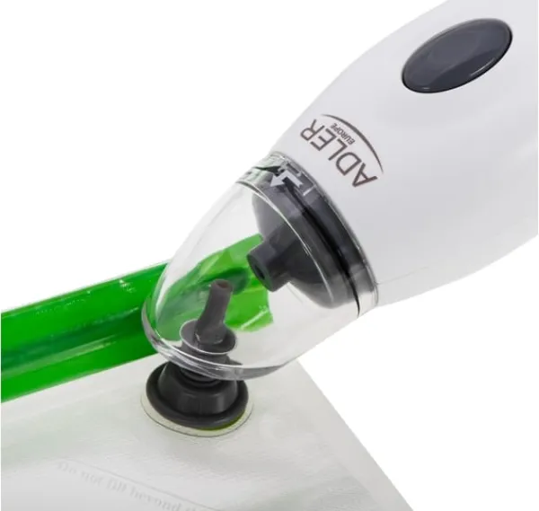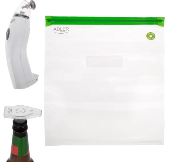 Övriga funktioner: Vakuumpumpen stängs automatiskt av när all luft har tagits bort från påsar eller flaskor, vilket säkerställer en lufttät försegling; Enheten kan drivas via en nätadapter eller batterier, vilket gör den idealisk för hemmabruk, camping eller resor; Lämplig för de flesta vanliga glasflaskor, perfekt för att försegla vin, juice eller andra drycker; Återanvändbara vakuumpåsar: 2x (22cm x 21cm), 2x (22cm x 31cm), 2x (26cm x 28cm), 2x (26cm x 34cm), 2x (30cm x 34cm)