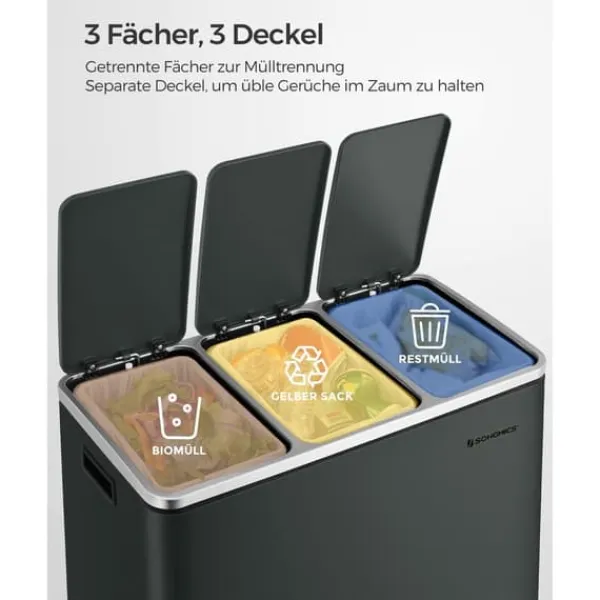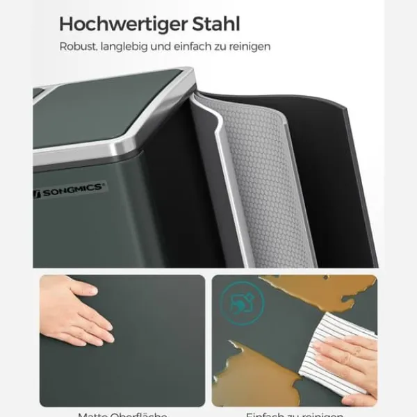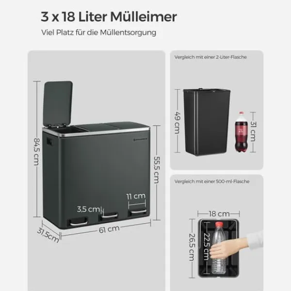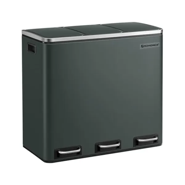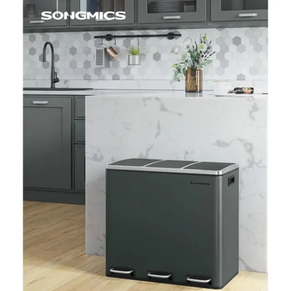 Denna eleganta pedalhink med tre fack gör återvinning och avfallssortering enkel och hygienisk tack vare handsfree-funktion och mjukstängande lock. De urtagbara innerhinkarna med handtag gör rengöring och underhåll smidigt, medan den rektangulära designen passar snyggt mot väggen för att spara plats.