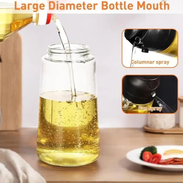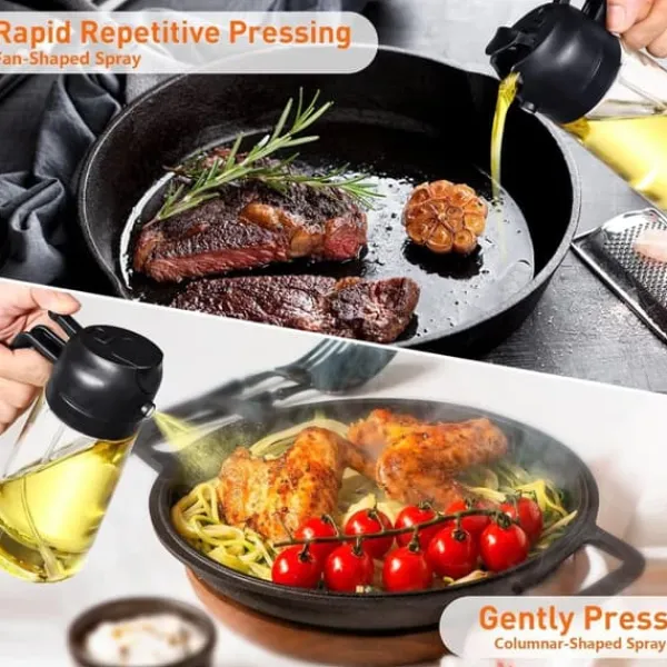 Två justerbara lägen: Sprayflaskan fungerar som både oljedimma-spridare och hällare. Tryck på handtaget för att spraya en fin och jämn oljedimma; lätt tryck ger fin dimma, hårdare tryck ger jämn oljeflöde. Den unika knappdesignen gör det enkelt