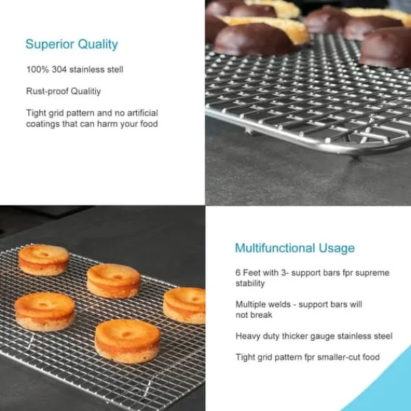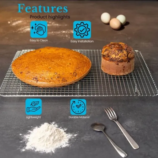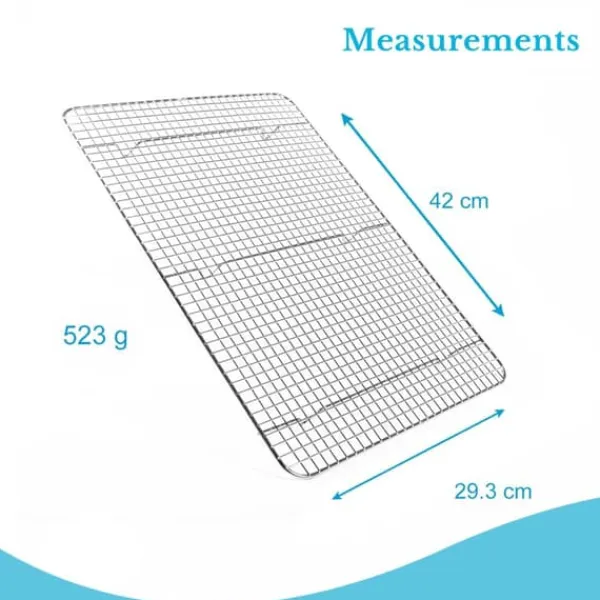 Den är rektangulär med stänger som är placerade i ett rutmönster och fast svetsade fötter som är 2 cm höga. Dessa ger utmärkt luftcirkulation för snabbare kylning av bakverken.