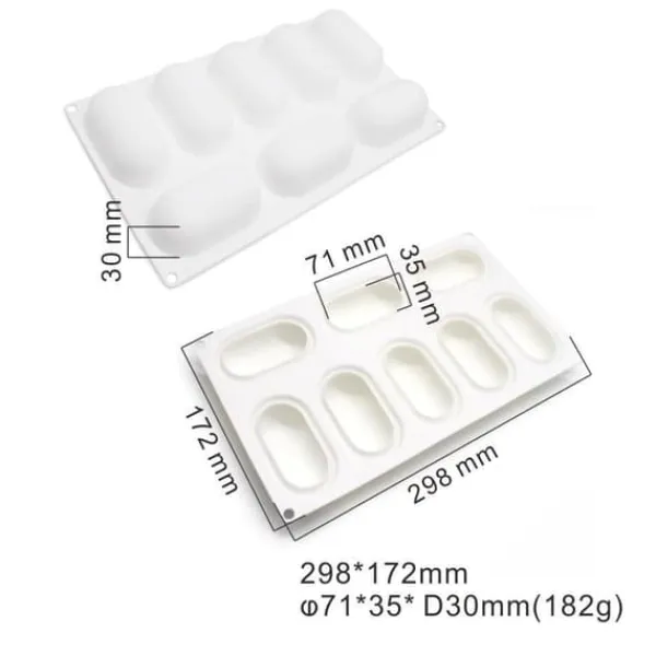 Med denna silikonform kan du göra 8st vackra avlånga portionsbakelser. Gör moussen/smällt chokladen och fyll formen. Låt stelna och tryck sedan ut figurerna. Perfekt som bakform eller för att gjuta exempelvis mousser, pannacottor eller glasskupoler. Formen går att använda både i ugn (max 230 °C) och mikrovågsugn, tål att frysas (lägst -30 °C) och maskindiskas. Den går att använda till t.ex. choklad, mousse, kaksmet, jello, sockerpasta och marsipan.