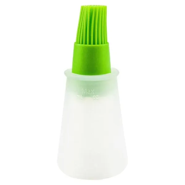 Den här gröna silikonpenseln med tillhörande behållare är ett användbart köksredskap till matlagning. Flaskan är klämbar och trycker ut innehållet till penseln, vilket gör det lite enklare och snabbare att pensla. Fungerar bra som bakpensel eller som oljepensel du kan använda som ett grill tillbehör. På sidan är flaskan märkt med mått angivna i ml och oz och den rymmer upp till 60 ml respektive 2 fl oz.