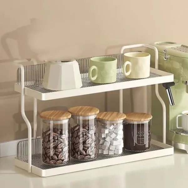 2、 Dubbellagerdesign: Maximerar utrymmet på bänkskivan, denna 2-vånings förvaringshylla ger gott om förvaring och hjälper till att hålla ditt kök organiserat och snyggt.