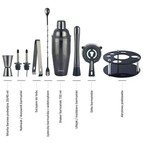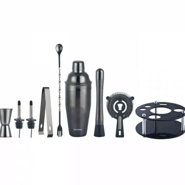 En solid, hållbar och kraftig uppsättning av högkvalitativa bartillbehör för att göra cocktails, gjorda av rostfritt stål.