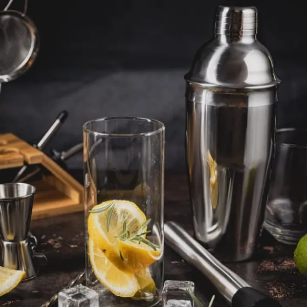 En solid, hållbar och kraftig uppsättning av högkvalitativa bartillbehör för att göra cocktails, gjorda av rostfritt stål.