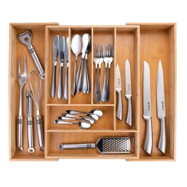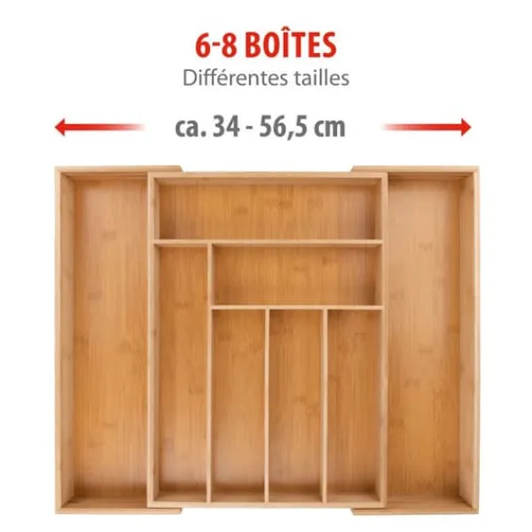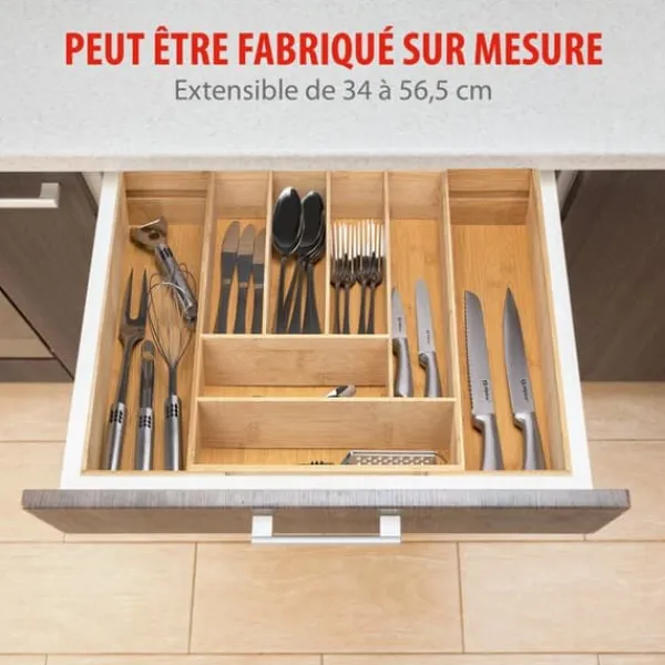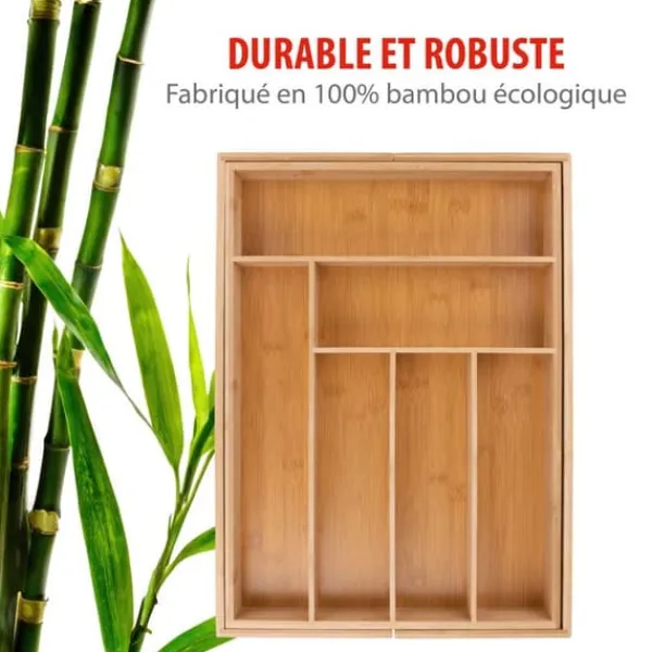 Det uttöjbara bestickställ i ekologisk bambu Alpina passar i alla lådor. Med måtten 46 x 34 cm kan det sträcka sig upp till 56,5 cm och erbjuder 6 fack för små bestick. Hållbart och elegant, det är vattentåligt och kräver lite underhåll, perfekt för ett organiserat kök.