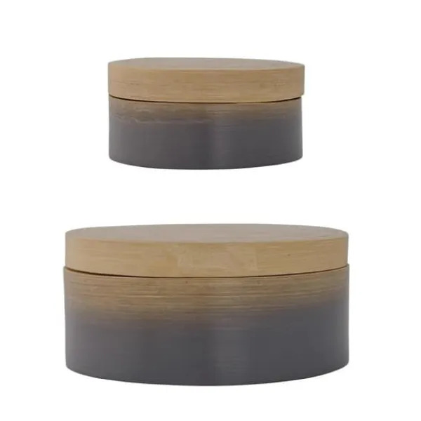 Set med 2 st burkar med lock till båda i bambu, målade i grått. Bra storlek för att förvara småsaker, smycken eller bara som dekoration.