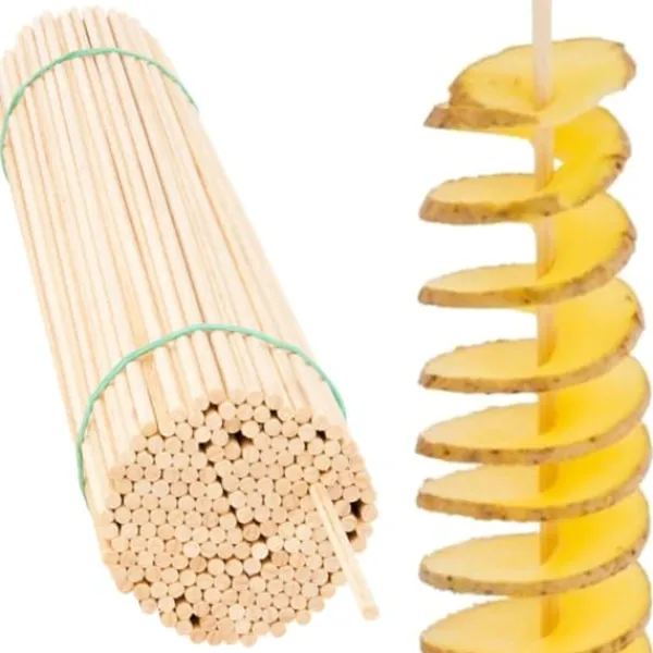 Produkt ID: 1010604 Højkvalitets pinde af bøgetræ beregnet til fremstilling af fritter på pind, snoede kartofler eller Twister Chips. Træpindene er polerede og har en æstetisk finish. Parametre – længde: 45 cm – diameter: 4 mm – form: rund – materiale: bøgetræ – certificeret af National Institute of Hygiene Sættet indeholder: – et sæt med 100 træpinde til Twister Chips lolly fries