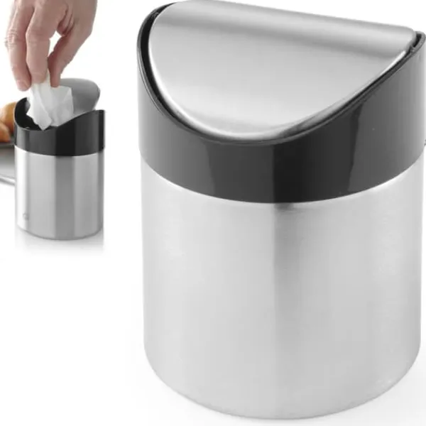 Producentkode: 440711 Miniature affaldsbeholder til bordplader fra Hendi. Den er udstyret med et hængslet låg i rustfrit stål og en sort plastkant. Produktegenskaber: – Bordaffaldsbeholder, – Rustfrit stål, – Svingbart låg. Tekniske data: – Katalognummer – 440711 – Artikeltilstand – Ny – Materiale – Rustfrit stål – Dæksel – Hængslet – Dimensioner – dia. 95 x 130 mm Sættet indeholder: – Bordaffaldsbeholder – Hendi 440711.