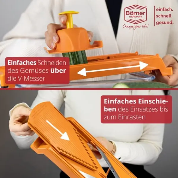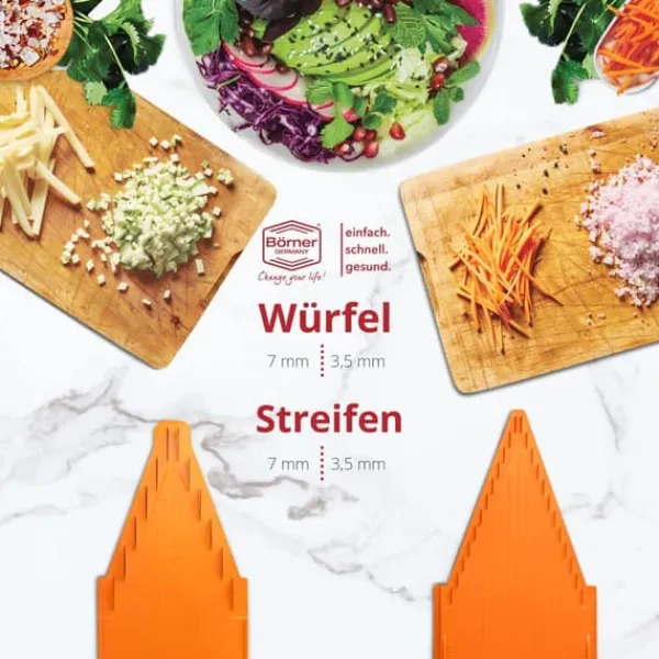 Den välkända Borner grönsaksskäraren V3 TrendLine med två spår gör att du snabbt och enkelt kan skära skivor och pinnar i två olika tjocklekar. Du kan också skära kuber med V3 enkelt, snabbt och jämnt än någonsin tidigare.