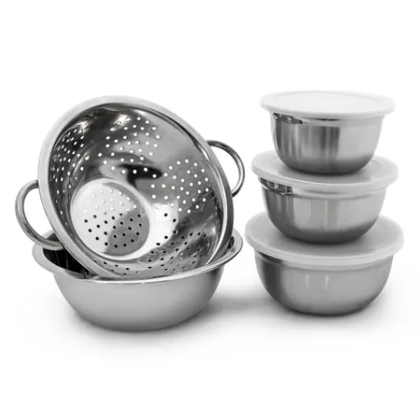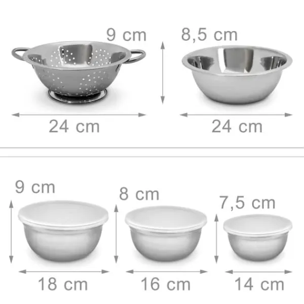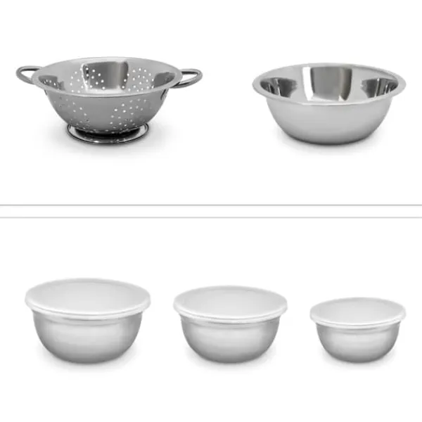 Detta mångsidiga set med skålar i rostfritt stål är perfekt för en mängd olika köksuppgifter, från att blanda och röra till servering och förvaring av mat. Setet innehåller flera skålstorlekar med lock som bevarar färskheten samt ett praktiskt durkslag för att sila eller skölja ingredienser, vilket gör det till ett oumbärligt tillskott i varje kök. Njut av enkel matlagning och organisering med detta praktiska set.