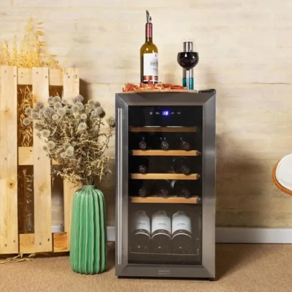 Cecotec Bolero GrandSommelier 1550 Inox Compressor vinkyl erbjuder förvaring för upp till 15 flaskor, vilket gör att du kan lagra dina favoritviner under optimala förhållanden. Utrustad med en kraftfull kompressor säkerställer den en låg ljudnivå på 39 dB och vibrationsfri drift, perfekt för installation i vilket rum som helst. Temperaturen kan justeras mellan 5 och 18°C, vilket garanterar en perfekt förvaring av dina viner. Den beröringskänsliga kontrollpanelen gör det enkelt att hantera alla funktioner: temperaturinställning, aktivering av belysning, val mellan Fahrenheit eller Celsius och låsning av driften. Njut av en tyst och effektiv vinkyl för att njuta av varje droppe av dina viner under de bästa förhållandena.