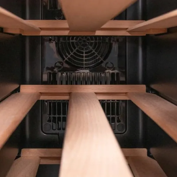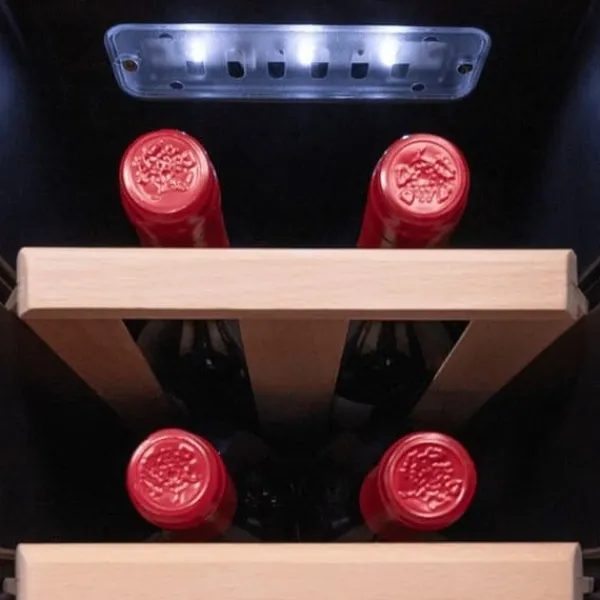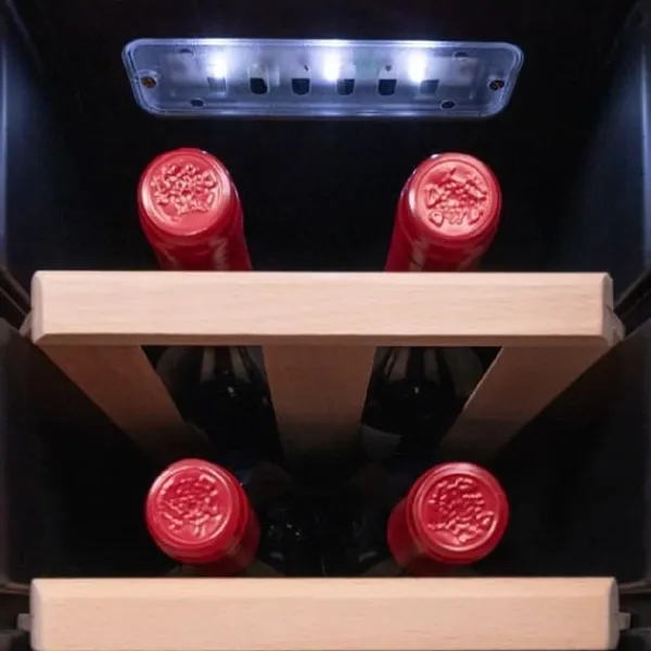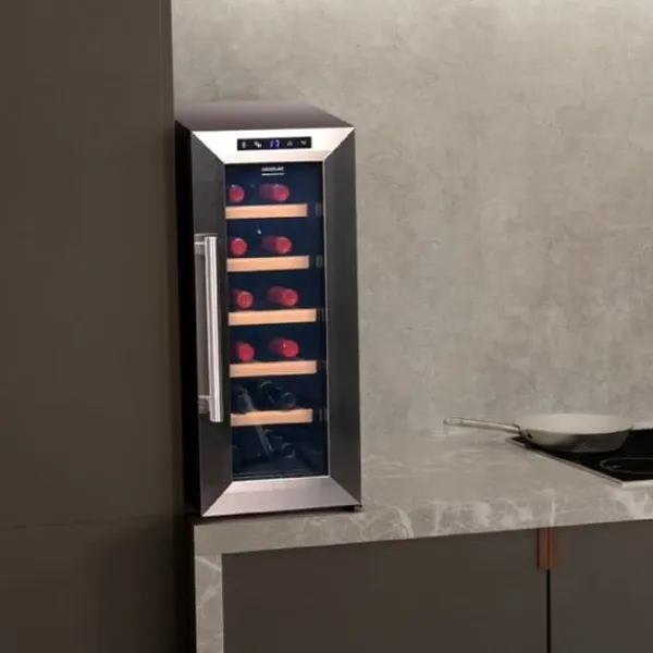 Cecotec Bolero GrandSommelier 1270 CoolWood vinkyl erbjuder stor kapacitet för 12 flaskor, perfekt för att förvara dina favoritviner. Med ett termoelektriskt kylsystem säkerställer den tyst drift med en ljudnivå på endast 35 dB, utan vibrationer, vilket garanterar din lugn och ro. Temperaturen är justerbar mellan 8 och 18°C, vilket gör att du kan anpassa det inre klimatet efter dina preferenser. Den beröringskänsliga kontrollpanelen gör det enkelt att hantera temperaturen, den inre LED-belysningen, och valet mellan Fahrenheit eller Celsius. Dess eleganta design i trä och rostfritt stål passar perfekt i alla utrymmen. Dessutom är denna vinkyl miljövänlig tack vare användningen av icke-skadliga gaser. Njut av en optimal visning av dina flaskor tack vare den inre LED-belysningen. Typ av vinkyl: Termoelektrisk. Kapacitet: 12 flaskor.