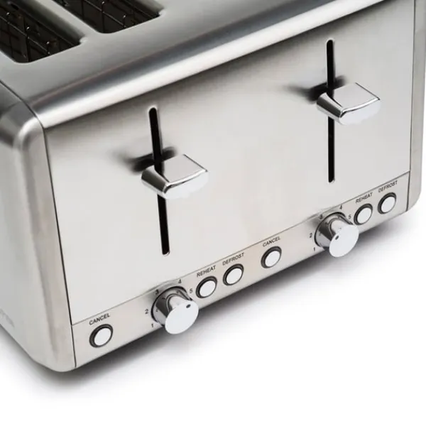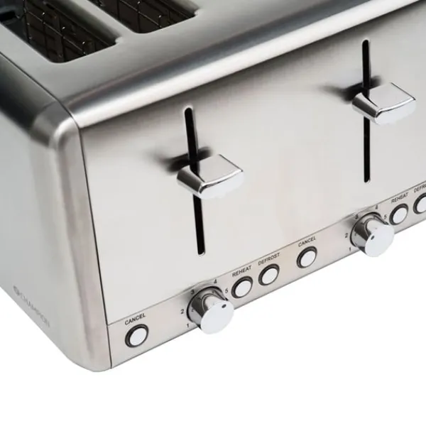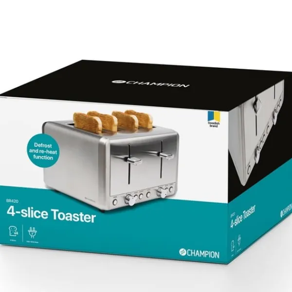 Champions brödrost ger gyllene rostat bröd för familjens lugna morgonstunder. Med 6 ställbara värmenivåer väljer du enkelt den nivå av rostning du önskar. Med en stilren designen i rostfritt stål blir brödrosten en fin detalj i köket. Brödrosten rymmer 4 brödskivor per rostning och har funktioner för upptining samt återuppvärmning.