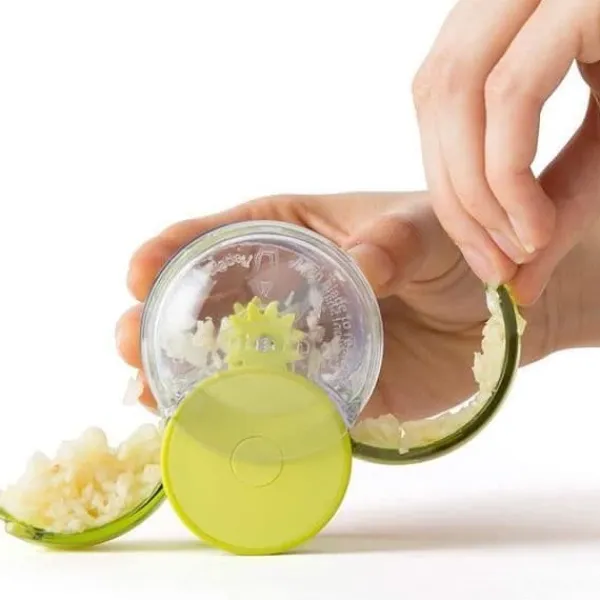 CHEF’N Garlic Zoom vitlökspressen är ett praktiskt tillbehör för att snabbt hacka och skiva vitlöksklyftor. Tillverkad av plast, den har avtagbara fack för att undvika kontakt med vassa knivar. Dess mått är 6,5 x 5 x 7 cm.