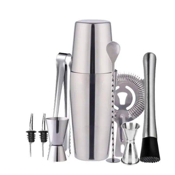Drinksked, cocktailsil, måttglas: Drinkskeden är tillräckligt lång för att nå ner och röra om i shakern. Cocktailsilen är perfekt för att hälla upp drinken men inte få med is eller fruktbitar. Det ena måttglaset rymmer 15 och 30 ml. Det andra rymmer 25 och 50 ml.