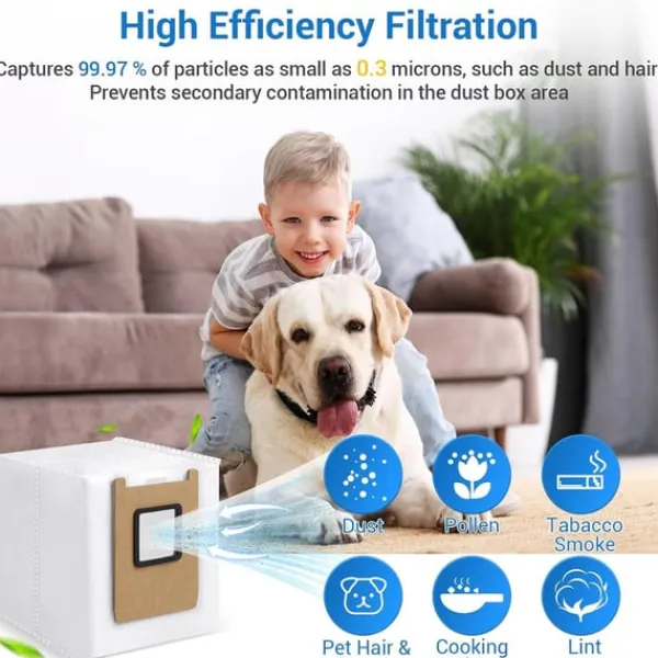 Effektiv dammuppsamling: Dessa ersättningsdammpåsar är designade för effektiv dammuppsamling, vilket säkerställer att din Eufy RoboVac E28 Omni och E25 Omni robotdammsugare bibehåller optimal prestanda. Det högkvalitativa non-woven-tyget fångar effektivt upp fina partiklar, damm och skräp och förhindrar att de återcirkuleras i luften. Regelbunden byte av dammpåsar hjälper till att hålla ditt hem rent och fritt från allergener, vilket ger en hälsosammare livsmiljö för dig och din familj. Dessa påsar är enkla att installera och ta bort, vilket gör underhållet enkelt.