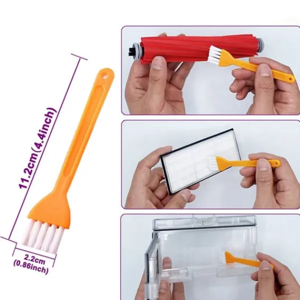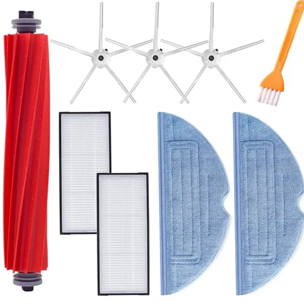 Xiaomi Roborock tillbehör som passar till modellerna Roborock S7/S7 Plus/T7/T7 Plus/T7s/T7s Plus. Satsen innehåller huvudborste (gummiborste), sidoborstar, moppdukar och dammsugarfilter samt ett rengöringsverktyg för att rensa reservdelarna mellan bytena.