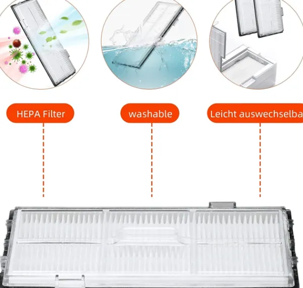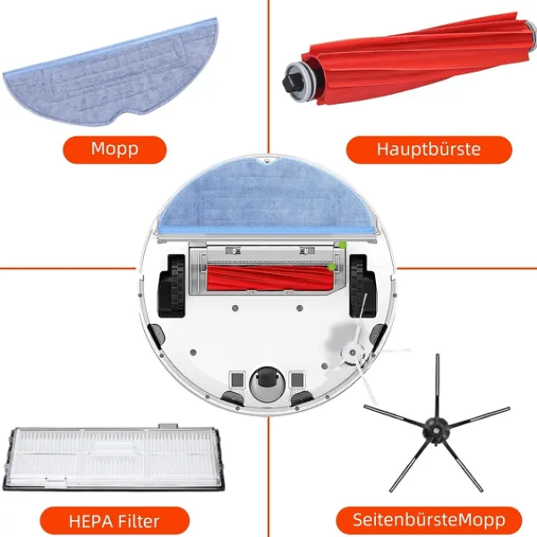 Alla viktiga tillbehör i ett set: Setet innehåller 2 st huvudborstar och flera sidoborstar, filter och moppdukar med optimal passform och enkla att byta.