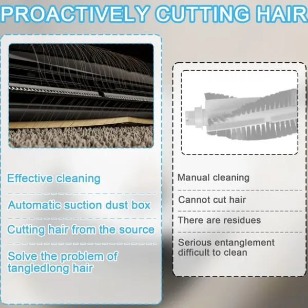 Anti-trassel Design: Anti-trassel designen minimerar hårinpackning, vilket säkerställer smidig och oavbruten drift av din Dreame dammsugare. Denna funktion är avgörande för att upprätthålla enhetens livslängd och effektivitet. Genom att förhindra att hår samlas runt borsten minskar det belastningen på motorn och förlänger borstens livslängd. Denna design är särskilt fördelaktig för hushåll med husdjur eller individer med långt hår, vilket ger en problemfri rengöringsupplevelse. Det minskade behovet av underhåll innebär mer tid att njuta av ett rent hem.
