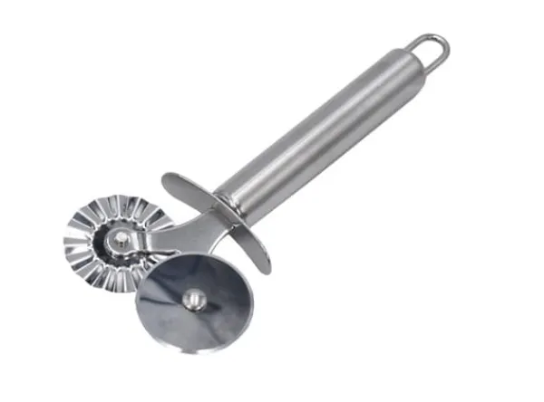 En rostfri stålskärare för att skära deg, dumplings och till och med pizza. Utrustad med två hjul, det första med ett slätt mönster, det andra med ett vågigt mönster