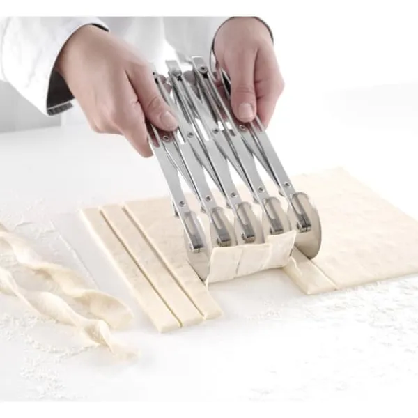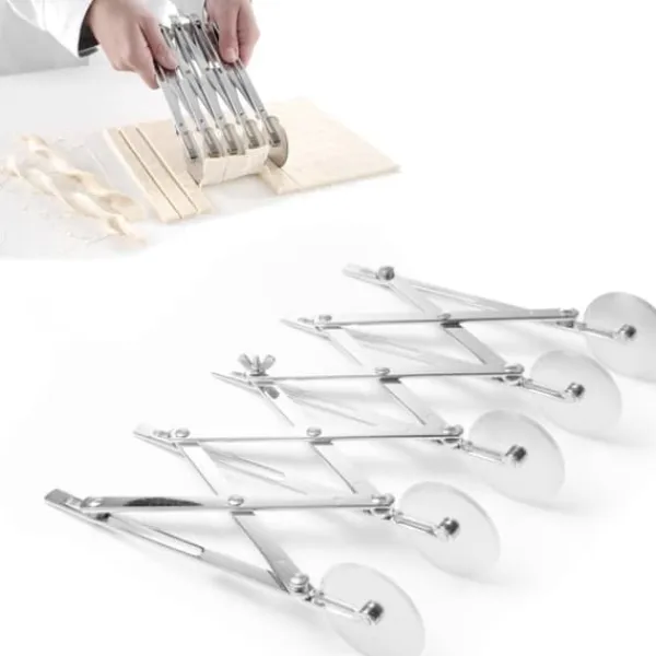 Producentens navn: HENDI 515044 Justerbar kagetusch med mellemrum fra 13 til 125 mm fra Hendi er et tilbehør designet til professionelle konditorier og bagerier. Markøren gør det nemmere at præcist skære eller markere skærelinjer til kager, kager og lignende. Strukturen er lavet af rustfrit stål og udstyret med fem enkeltsidede klinger. Egenskaber og funktioner: – lavet af rustfrit stål, – 5 enkeltsidede knive, – diameter på skæreskiver: ø55 mm, – glat overflade af skiverne forhindrer dejen i at klæbe til overfladen af kniven, – justerbar skærebredde fra 13 til 125 mm, – mål (L x S): 56 x 222 mm. Sættet indeholder: – Dejmærke, justerbar, 13-125 mm, 5 blade.