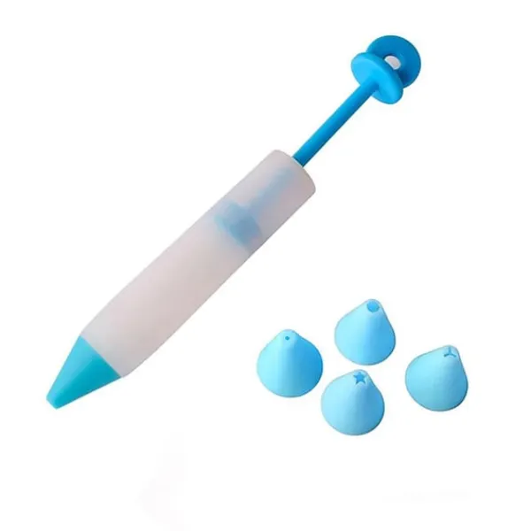 En smart och smidig ”penna” för att dekorera tårtor och andra bakverk. Fyll pennan med choklad, glasyr eller något annat trögflytande och rita sedan det du vill. Det funkar till fina detaljer, text och annat liknande. Pennan är tillverkad i smidig silikon som är tålig och enkel att rengöra. Dekorationspennan har en sug-mekanism i plast för att enkelt fylla den. Enkel att greppa och ger bättre kontroll för små detaljer. Den här varianten har fyra utbytbara spetsar med olika form på hålet, så att du kan skapa lite olika effekter. OBS – bilden visar fyra samt en på till pennan men det är endast för att visa utseende, det är endast fyra spetsar totalt som följer med!