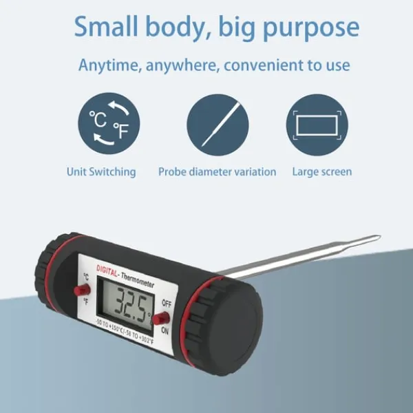 Noggranna temperaturavläsningar: Denna digitala mattermometer ger mycket noggranna temperaturavläsningar, vilket säkerställer att din mat tillagas till perfektion varje gång. Med ett temperaturområde på -50℃ till 150℃ och en displayupplösning på 0,1℃ kan du övervaka den interna temperaturen på kött, vätskor och bakverk med precision. Noggrannheten på ±1℃ garanterar tillförlitliga resultat för alla dina kulinariska strävanden. Oavsett om du grillar biffar, bakar bröd eller brygger kaffe, kommer denna termometer att hjälpa dig att uppnå konsekventa och läckra resultat.
