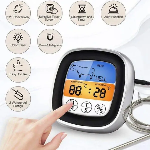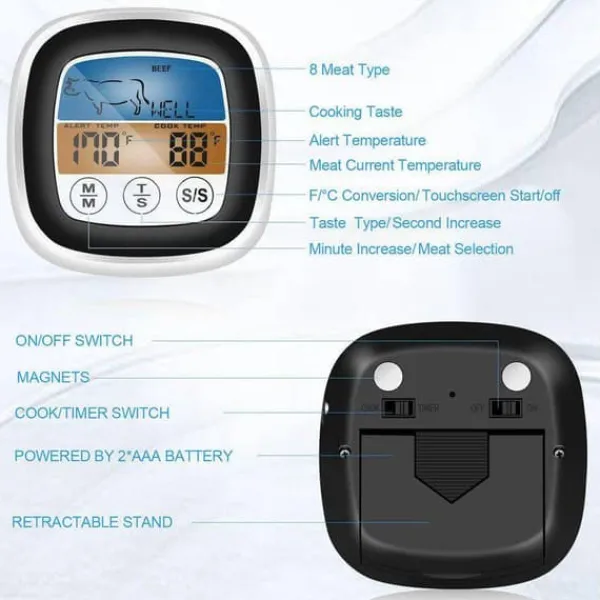 Funktionerna inkluderar två ryggmagneter för enkel förvaring, en automatisk av/på-funktion och ett praktiskt larm som varnar när maten når önskad temperatur. Du kan även välja att visa temperaturen i antingen Fahrenheit eller Celsius – smidigt och flexibelt!