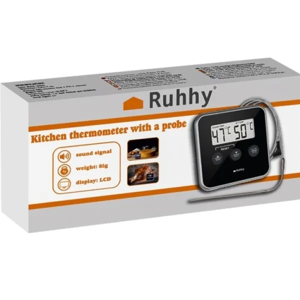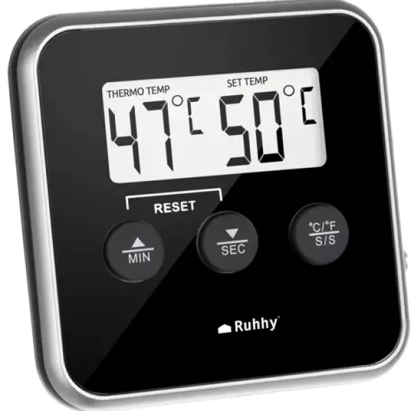 Denna digitala kökstermometer är den perfekta följeslagaren för alla hemmakockar. Med sin stora och klara LCD-skärm blir avläsning av temperaturer lekande lätt, oavsett om du befinner dig i ett soligt kök eller en dimmig grillplats. Dess praktiska magnetiska baksida gör att du enkelt kan fästa termometern på alla metallytor – perfekt när du behöver ha händerna fria.