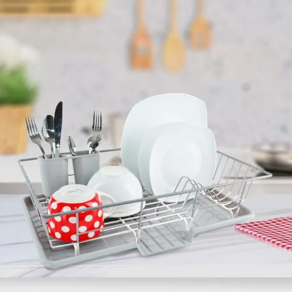 ✅ SOLID – Torkställning tillverkad av förkromad tråd av rostfritt stål, säkrad med en extra skyddande beläggning i grått och vitt. Utrustad med en avtagbar bricka och bestickställ tillverkad av högkvalitativ grå plast.